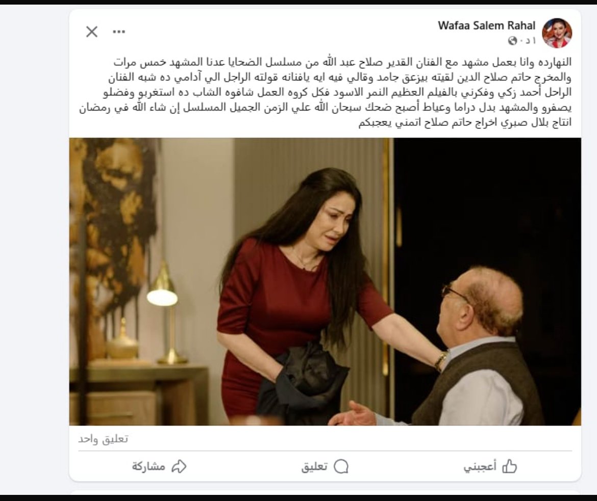 وأكدت وفاء سالم أن الموقف أعاد إليها أجواء «الزمن الجميل»، مشيرة إلى أن مسلسل «الضحايا» يُعرض في موسم رمضان، وهو من إنتاج بلال صبري، وإخراج حاتم صلاح.