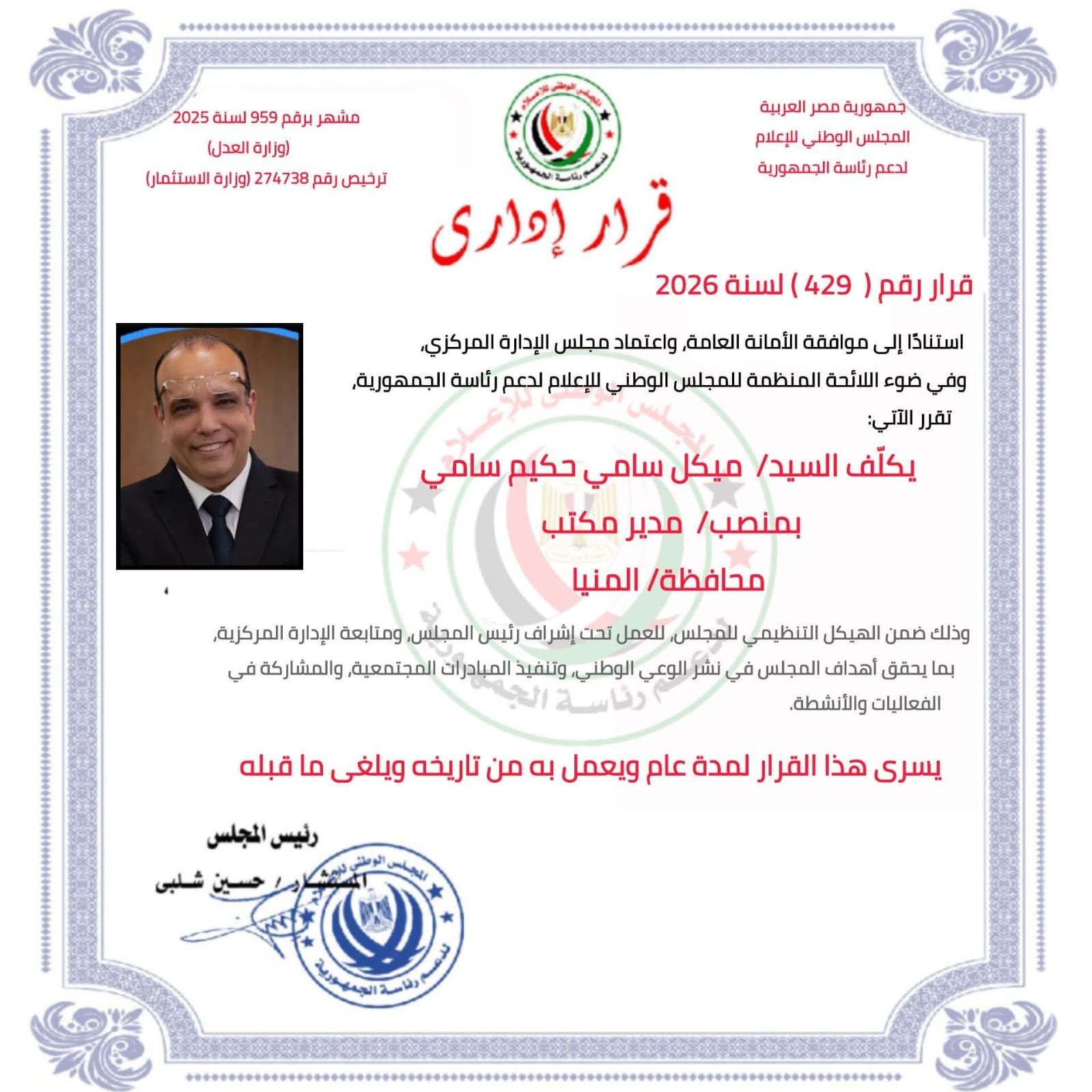 في إطار حرص الدولة على تعزيز الأداء المؤسسي ودعم منظومة الإعلام الوطني، صدر القرار رقم 429 لسنة 2026 بتكليف الدكتور مايكل سامي حكيم مديرًا لمكتب المجلس الوطني للإعلام لدعم رئاسة الجمهورية لمحافظةالمنيا، وذلك تقديرًا لدوره الوطني وخبراته المتراكمة في مجالات الإدارة والإعلام والعمل العام.