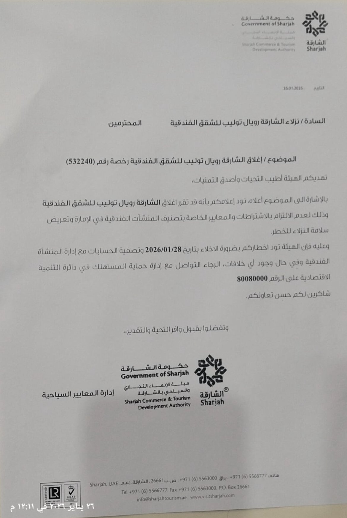 الاعلامى الدكتور مجدي كامل الهواري يكتب : هيئة الإنماء التجاري و السياحي بالشارقة تغلق 90 غرفة سياحية بفندق رويال تيوليب .