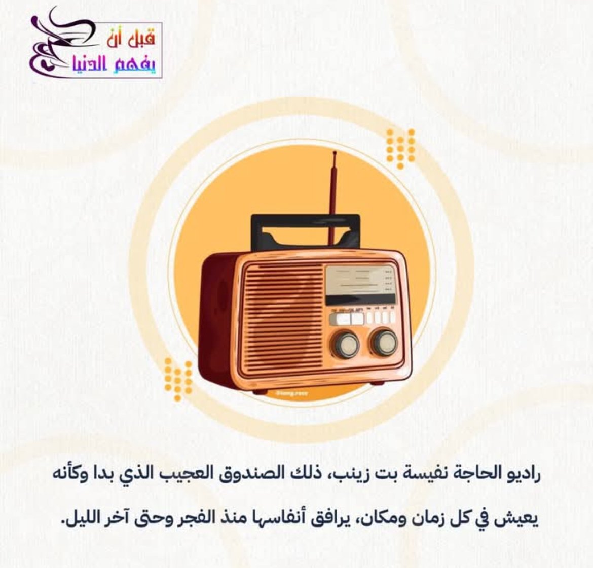 كانت نفيسة تمد يدها إلى راديوها كما تمد الأم يدها لطفلها الصغير، فقد ظلت تربطه إلى صدر أمينتها بحبل بسيط مستأنسة به، فيهمس لها بصوت يتسلل إلى قلبها صوتٌ يذكرها بنعمٍ لا تُرى، ويحدّثها عن أناسٍ يكابدون ليلهم ونهارهم.